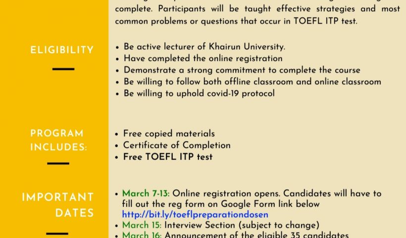 Unkhair. Unit Pelaksana Tugas (UPT) Bahasa akan menyelenggarakan kursus TOEFL PREPARATION buat 35 Dosen di lingkungan Universitas Khairun, Kursus ini sangat bermanfaat bagi Dosen terpilih…
