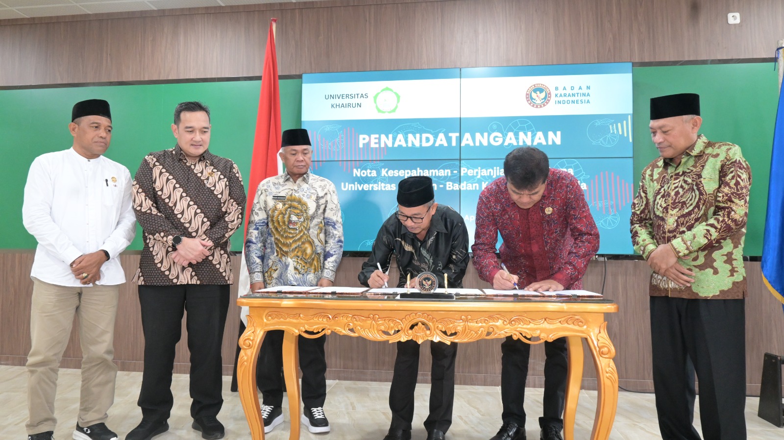 UNKHAIR, Universitas Khairun (Unkhair) dan Badan Karantina Indonesia resmi menandatangani nota kesepahaman kerja sama strategis, berlangsung di Gedung Kuliah Terpadu SBSN Kampus 2 Unkhair, Gambesi, Ternate Kamis (24/4).