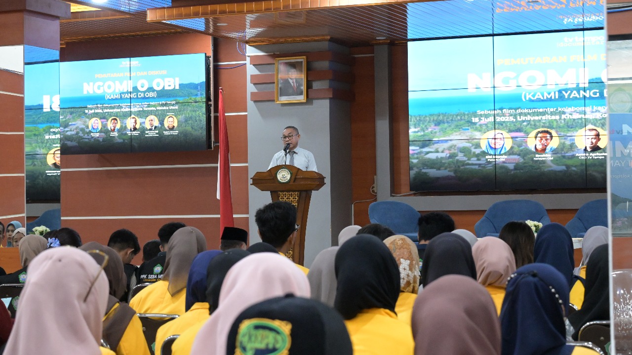UNKHAIR, Film dokumenter berjudul Ngomi O Obi (Kami yang di Obi), karya kolaborasi jurnalis visual Arfan Sabran dan TV Tempo, diputar di Universitas Khairun (Unkhair), di Aula Nuku, Gedung Rektorat, Ternate Selasa (15/7/2025).