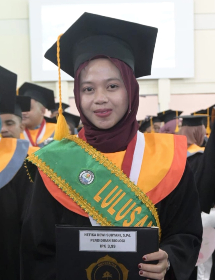 UNKHAIR, Hefika Dewi Suryani, mahasiswi Program Studi Pendidikan Biologi Fakultas Keguruan dan Ilmu Pendidikan (FKIP) Universitas Khairun (Unkhair), meraih predikat lulusan terbaik pada Wisuda Periode II Tahun Akademik 2024–2025, Sabtu (27/9/2025).
