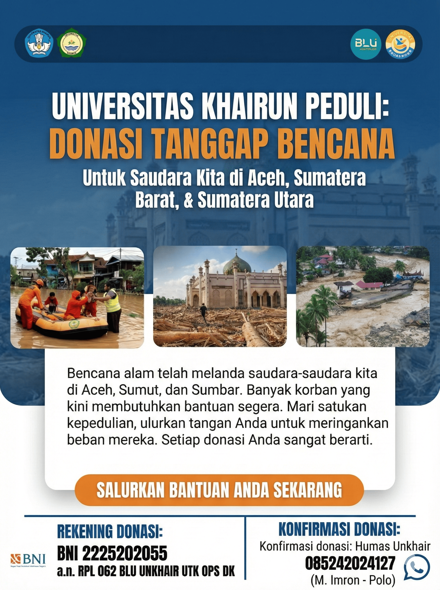 UNKHAIR, Rektor Universitas Khairun (Unkhair), Prof. Dr. Abdullah W. Jabid, SE., MM, resmi mengeluarkan surat imbauan penggalangan dana kemanusiaan bagi korban bencana banjir bandang dan tanah longsor yang melanda wilayah Sumatera Barat, Sumatera Utara, dan Aceh.