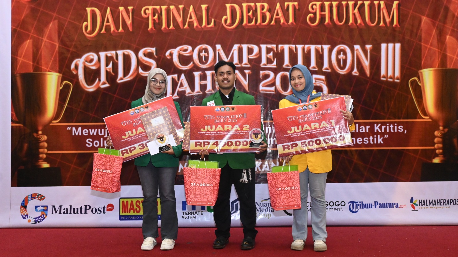 Pengumuman pemenang disampaikan usai rangkaian malam puncak di Ballroom Royal’s Resto and Function Hall, Kota Ternate, Selasa (9/12/2025), bersamaan dengan penutupan Final Kompetisi Debat Hukum CFDS Competition ke-III Tahun 2025.
