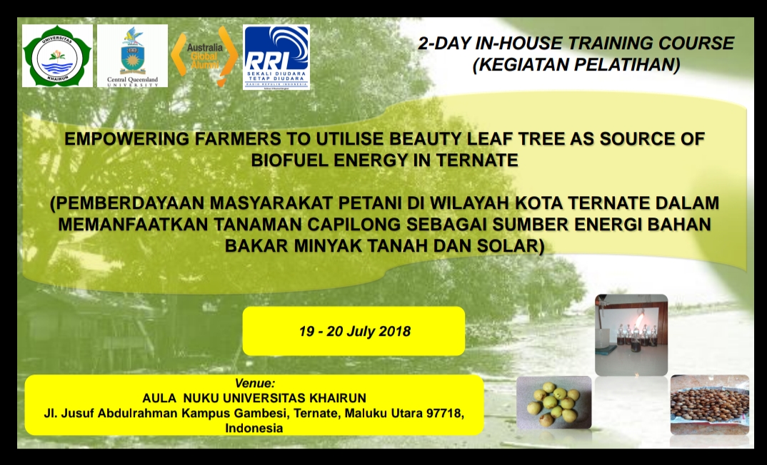Pelatihan ini melibatkan para petani maupun mahasiswa dan peneliti lainnya, pelatihan ini sangat berguna untuk pemberdayaan masyarakat petani di wilayah kota ternate dalam memanfaatkan tanaman capilong sebagai sumber energi bahan bakar minyak tanah dan solar. Untuk mengetahui informasi selanjutnya bisa menghubungi Ibu Lily Ishak, Ph.D (081245216811)