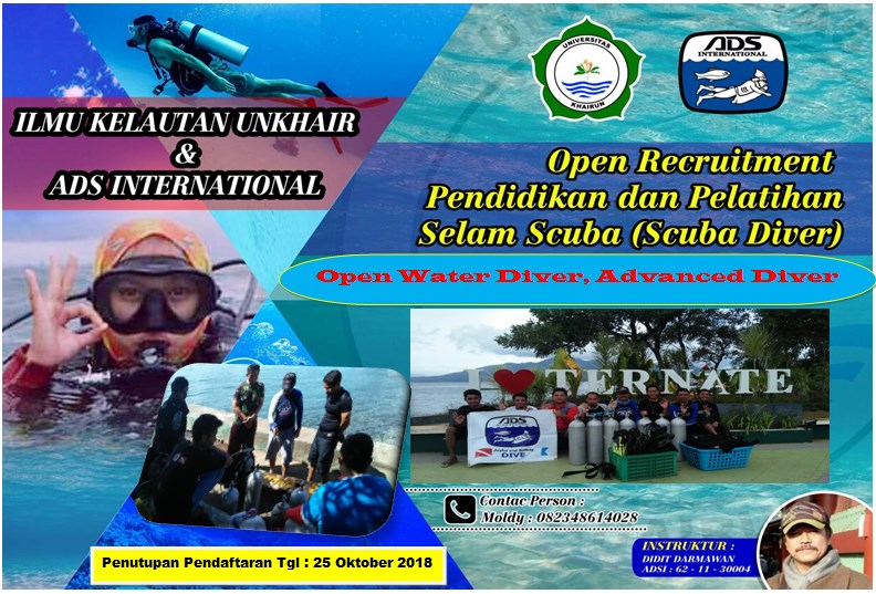 Unkhair.ac.id. Fakultas Periakanan dan Ilmu Kelautan Universitas Khairun membuka pelatihan selam bersertifikat internasional, kegiatan pelatihan selam diselenggarakan berkat kerjasama antara Fakultas Perikanan dan Ilmu Kelautan dengan Assocation Diving School Internasional, intruktur dalam kegiatan ini adalah Bapak Didit Darmawan, para peserta pelatihan akan diberikan sertivikat atau kartu tanda kemahiran sesuai tingkat pelatihan.