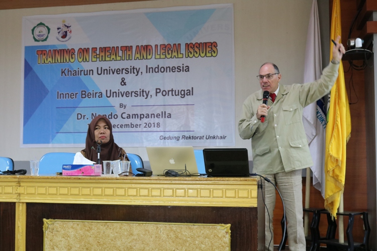 Unkhair.ac.id Tindak lanjut dari kerjasama internasional antara Universitas Khairun dengan Inner Beira University, Portugal adalah dilaksanakan kegiatan “Training on e-health and legal issuses”. Kegiatan ini berlangsung mulai tanggal 13 sampai 15 Desember 2018 kemarin di aula Nuku gedung Rektorat Unkhair. Dr. Nando Campanella tampil sebagai pemateri tunggal, dihadapan mahasiswa Fakultas Kedokteran, Fakultas Hukum dan Fakultas KIP, beliau menyampaikan berbagai macam trobosan dalam ilmu kesehatan yang sekarang lagi berkembang, dengan mengenalkan berbagai aplikasi yang tersedia Dr. Nando Campanella mempraktikan berbagai macam situs kesehatan dunia yang dapat diakses oleh mahasiswa, dengan kemajuan teknologi seorang Mahasiswa wajib mengetahui semua aplikasi yang berkembang sehingga para mahasiswa dituntut harus mengetahui perkembangan era digital, untuk mahasiswa Fakultas Hukum sendiri Dr. Campanella menyampaikan bagaimana menghadapai kasus hukum dalam praktek kesehatan.