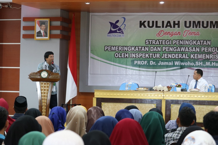 Unkhair.ac.id. Menghadapi daya saing era revolusi 4.0 dan menuju klaster baik Universitas Khairun terus mendorong kinerja serta akuntabilitas lebih baik lagi, dengan dukungan finansial dan otonomisasi lebih besar Universitas Khairun menuju ke PTN dengan kategori Badan Layanan Umum (BLU), hal ini disampaikan oleh Prof. Dr Jamal Wiwoho,SH.Mhum, yang berkunjung ke Universitas Khairun (Senin, 18 Februari 2019). kunjungan kali ini bukan untuk memonitoring Unkhair melainkan memberikan kuliah umum dihadapan Mahasiswa dan Civitas Akademikan Unkhair, Sebagai Inspektorat Jenderal Kemenristekdikti pria kelahiran Magelang, 8 Nopember 1961 dan ditemani oleh moderator Prof. Dr. Husen Alting, SH.MH (Rektor Unkhair) beliau memberikan kuliah umum dengan tema “Strategi Peningkatan Pemeringkatan Dan Pengawasan Perguruan Tinggi”.