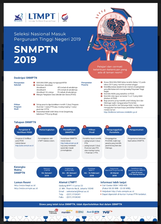 Unkhair.ac.id. Jadwal pengumuman hasil Seleksi Nasional Masuk Perguruan Tinggi Negeri (SNMPTN) 2019 dimajukan pada Jumat tanggal, 22 Maret 2019. Perubahan jadwal pengumuman tersebut diiformasikan Lembaga Tes Masuk Perguruan Tinggi (LTMPT) selaku penaggung jawab pelaksana SNMPTN.