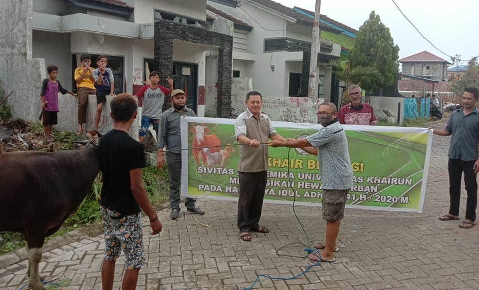 Unkhair.ac.id. Dalam menyambut hari raya Idul Adha 1441 Hijriyah / 2020 Masehi, Universitas Khairun dengan “Unkhair Peduli” menyalurkan 20 hewan untuk dikurbankan di sejumlah masjid di Kota Ternate dan Mesjid di Pulau Hiri dan Maitara. Hewan kurban ini terdiri dari 16 ekor sapi dan 4 ekor kambing.
