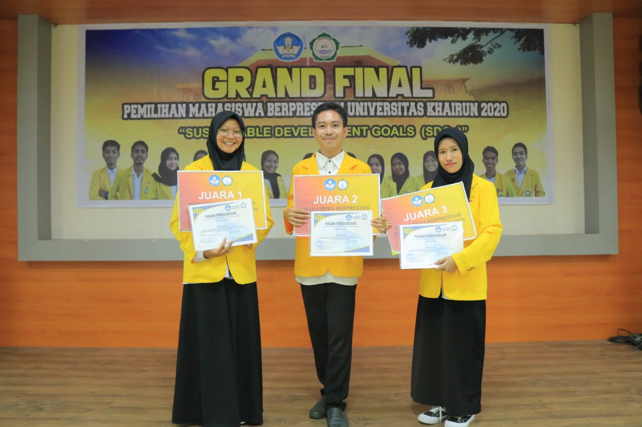 Unkhair.ac.id. Universitas Khairun menggelar pemilihan mahasiswa berprestasi. Kegiatan ini berlangsung di aula Nuku gedung Rektorat Universitas Khairun (Rabu, 30 Desember 2020). Karena masih dalam masa pandemik Covid-19, acara tersebut berlangsung terbatas tampa penonton dan siarkan melalui media kampus. Dari puluhan berkas yang masuk di panitia, tersisa empat belas berkas mahasiswa yang dianggap layak untuk masuk ke babak final. Ke empat belas mahasiswa yang masuk ke babak final adalah Janiah Husen dari Fakultas Pertanian. Dian Ayu Ningsih dari Fakultas Keguruan dan Ilmu Pendidikan. Angela dari Fransischa Pasimanyeku Fakultas Keguruan dan Ilmu Pendidikan. Maesa Akni dari Fakultas Ekonomi dan Bisnis. Nur Syafira Rahmadani dari Fakultas Pertanian. Rynaldi dari Fakultas Keguruan dan Ilmu Pendidikan. Dinda Rahmawati dari Fakultas Teknik. Rifki Ode Adu dari Fakultas Keguruan dan Ilmu Pendidikan. Nurul Fitri Ramadhan dari Fakultas Keguruan dan Ilmu Pendidikan. Arty Amalia Less dari Fakultas Teknik. Yusril Rafiqzal Zuldan dari Fakultas Kedokteran. Nurhidaya Tahir dari Fakultas Perikanan dan Kelautan. Anggun Rosa Ajie Safira dari dari Fakultas Perikanan dan Kelautan. Rahma Adi Arjun S. dari Fakultas Perikanan dan Kelautan.