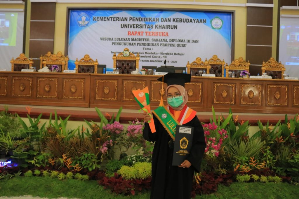 Unkhair.ac.id.. Terlahir dikeluarga sederhana tak membuat Nurul Chika Islami urungkan langkahnya untuk melanjutkan pendidikan ke jenjang lebih tinggi, dengan niat yang tulus serta dukungan dari kedua orang tua Chika panggilan akrabnya akhirnya dapat menyelesaikan pendidikan sarjana di Fakultas Keguruan dan Ilmu Pendidikan Program Studi Pendidikan Bahasa Inggris. Hari Ini, Jumat, 29 Januari 2021 Nurul Chika Islami mendapat kehormatan menjadi wisudawati terbaik dengan predikat pujian pada acara wisuda Tahun Akademik 2020/2021.