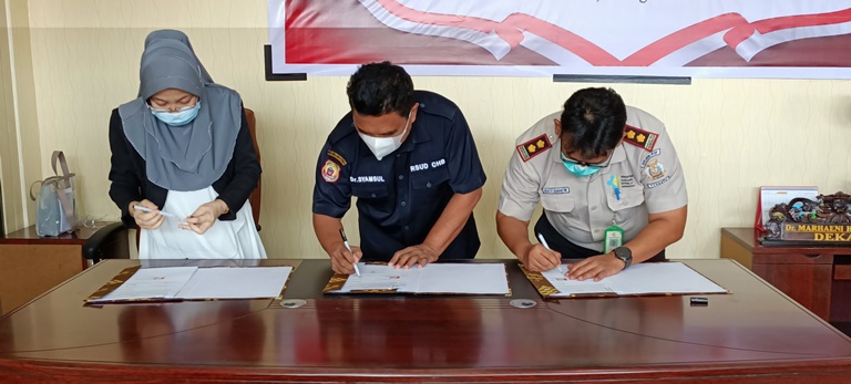 Unkhair. Fakultas Kedokteran Universitas Khairun bersama RSUD Dr. Chasan Boesoirie Ternate dan Kantor Kesehatan Pelabuhan Kelas III Ternate melaksanakan penandatanganan perjanjian kerjasama antar pihak. Kegiatan ini berlangsung di ruang Dekan Fakultas Kedokteran (Kamis,19 Agsutsu 2021).