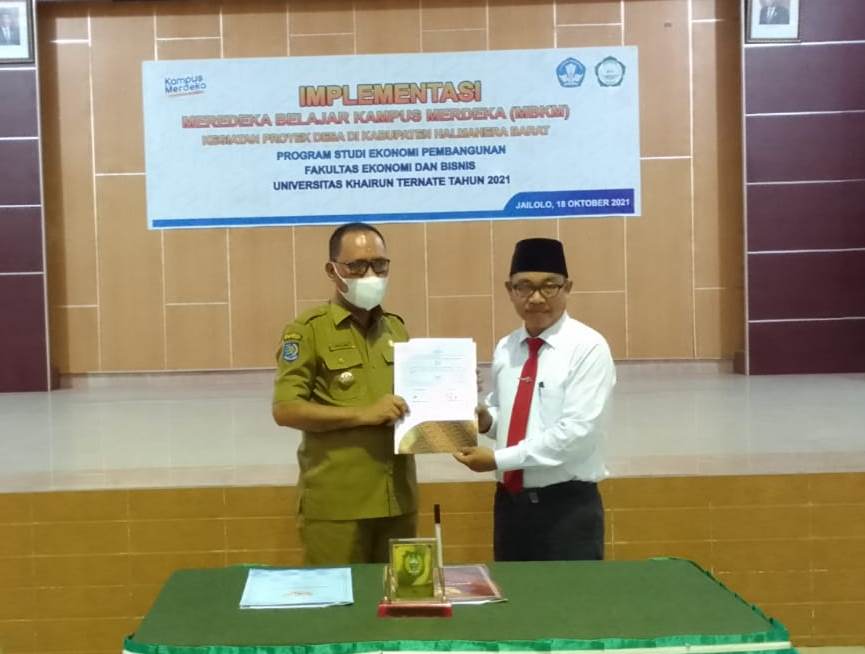 Kesempatan yang sama juga berlangsung penandatangan kerjasama yang dilaksanakan antara Koordinator Program Studi Ekonomi Pembangunan Aswir Hadi, SE.M.Si dengan 11 Kepada Desa Kabupaten Halmahera Barat. Turut hadir dalam kesempatan itu Kepala Desa Guemaadu Kec. Jailolo, Kepala Desa Galala Kec. Jailolo, Kepala Desa Gamlamo Kec. Jailolo, Kepala Desa Acango Kec. Jailolo, Kepala Desa Porniti Kec. Jailolo, Kepala Desa Marimbati Kec. Jailolo, Kepala Desa Tacim Kec. Sahu, Kepala Desa Susupu Kec. Sahu, Kepala Desa Lako Akelamo Kec. Sahu, Kepala Desa Lako Akediri Kec. Sahu, Kepala Desa Ropu Tengah Balu Kec. Sahu. Penandatangan kerjasama ini guna implementasi Merdeka Belajar Kampus Merdeka (MBKM).