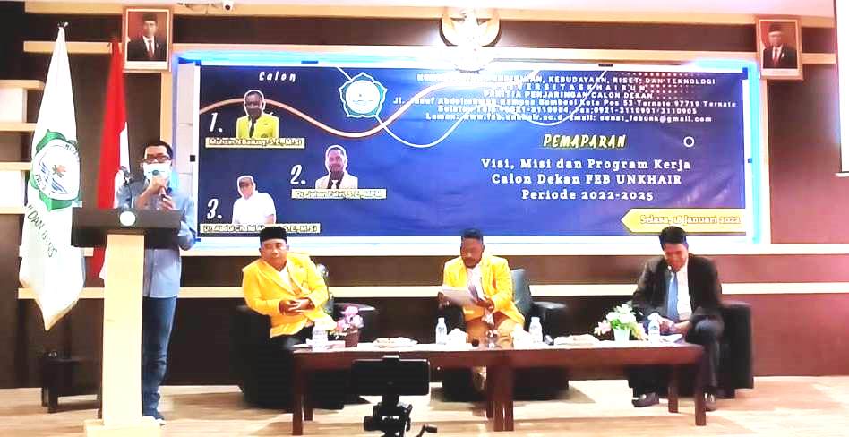 Unkhair. Penyampaian visi misi calon Dekan Fakultas Ekonomi dan Bisnis Universitas Khairun hari ini Selasa, 18 Januari 2021 digelar. Tiga kandidat Dekan Fakultas Ekonomi dan Bisnis periode 2022-2026 menyampaikan program kerja serta visi misi dihadapan Sivitas Akademika Fakultas Ekonomi dan Bisnis. Acara yang berlangsung di aula FEB ini dihadiri oleh Wakil Rektor Bidang Kemahasiswaan dan Kerjasama serta para Dosen dari berbagai Fakultas di lingkungan Universitas Khairun.