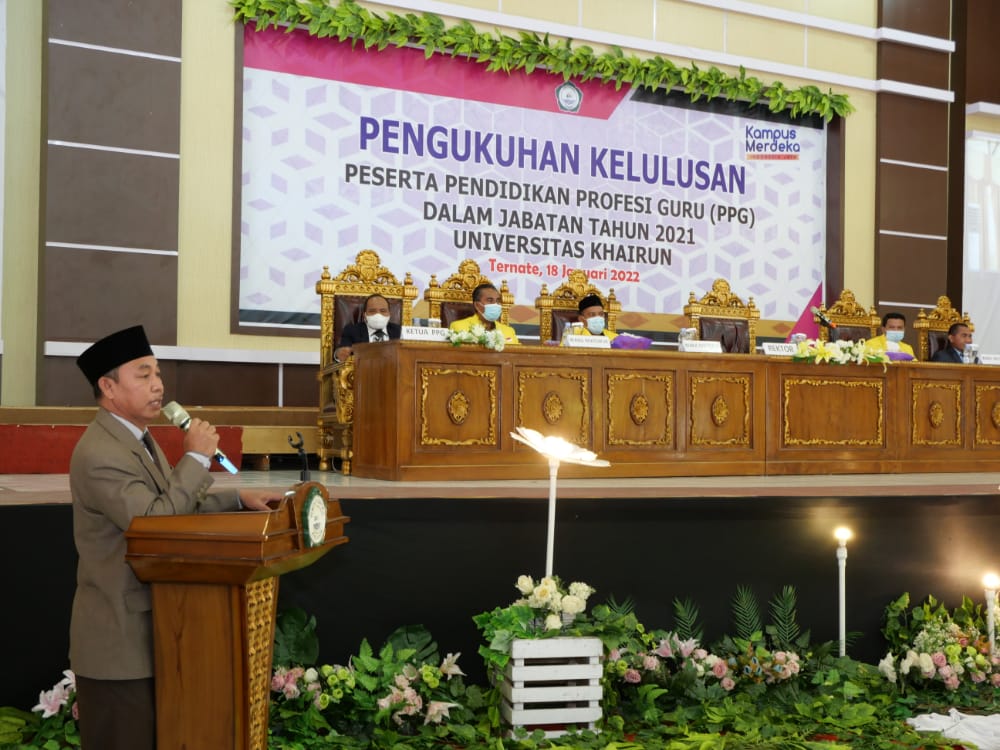 Rektor Universitas Khairun, Dr. M.Ridha Ajam,M.Hum dalam sambutannya mengucapkan selamat kepada lulusan pendidikan profesi guru yang pada hari ini mengikuti prosesi pengukuhan. Kepada alumni PPG, Rektor berharap dapat memaksimalkan tugas dan fungsinya sebagai seorang guru yang profesional.