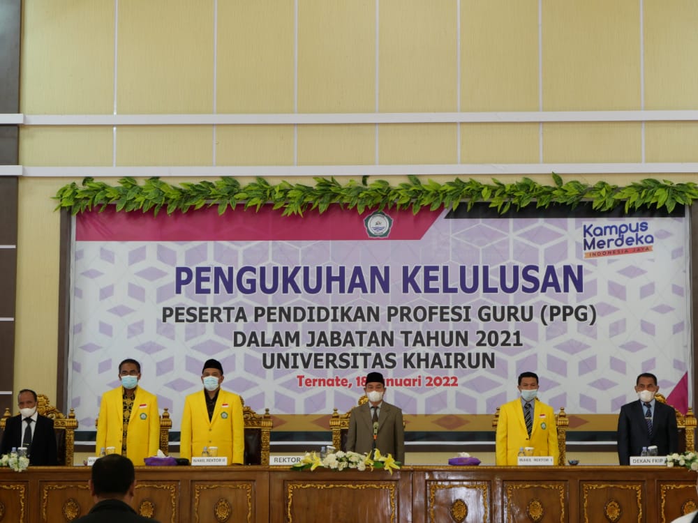 Unkhair. Pengukuhan lulusan Pendidikan Profesi Guru (PPG) dalam jabatan tahun 2021 hari ini Selasa, 18 Januari 2022 digelar. Dalam kesempatan itu, ย Rektor Universitas Khairun, Dr. M.Ridha Ajam,M.Hum mengukuhkan sebanyak 640 orang yang dinyatakan lulus dalam program PPG dalam jabatan. Seperti wisuda dan pengukuhan PPG tahun sebelumnya, kegiatan ini berlangsung di aula Banau kampus I Akehuda Universitas Khairun.