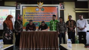 Unkhair. Rektor Universitas Khairun, Dr. M. Ridha Ajam, M.Hum bersama Rektor Universitas Siliwangi, Dr. Ir. Nundang Busaeri, M.T melaksanakan penandatangan nota kesepahaman tentang peningkatan Tri Dharma Perguruan Tinggi. Kegiatan ini berlangsung di aula gedung FKIP Unkhair (Selasa, 26 Juli 2022).