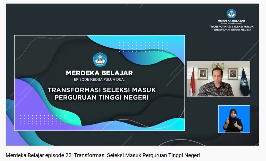 “Arah baru transformasi seleksi masuk PTN dilakukan melalui lima prinsip perubahan, yaitu mendorong pembelajaran yang menyeluruh, lebih berfokus pada kemampuan penalaran, lebih inklusif dan lebih mengakomodasi keragaman peserta didik, lebih transparan, serta lebih terintegrasi dengan mencakup bukan hanya program sarjana, tetapi juga diploma tiga dan diploma empat/sarjana terapan,” disampaikan Menteri Pendidikan, Kebudayaan, Riset, dan Teknologi (Mendikbudristek), Nadiem Anwar Makarim saat peluncuran Merdeka Belajar Episode Kedua Puluh Dua secara daring di Jakarta, Rabu (7/9).