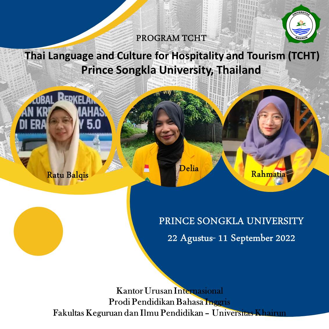 Unkhair. Tiga mahasiswi Universitas Khairun mengikuti perkuliahan di Prince Songkla University, PSU, Thailand. Tiga mahasiswi dari program studi Pendidikan Bahasa Inggris adalah Rahmatia, Delia Marshanda dan Ratu Balqis Ibrahim. Mereka mengikuti perkuliahan secara hybrid sejak tanggal, 22 Agustus dan berakhir 9 September 2022 kemarin.