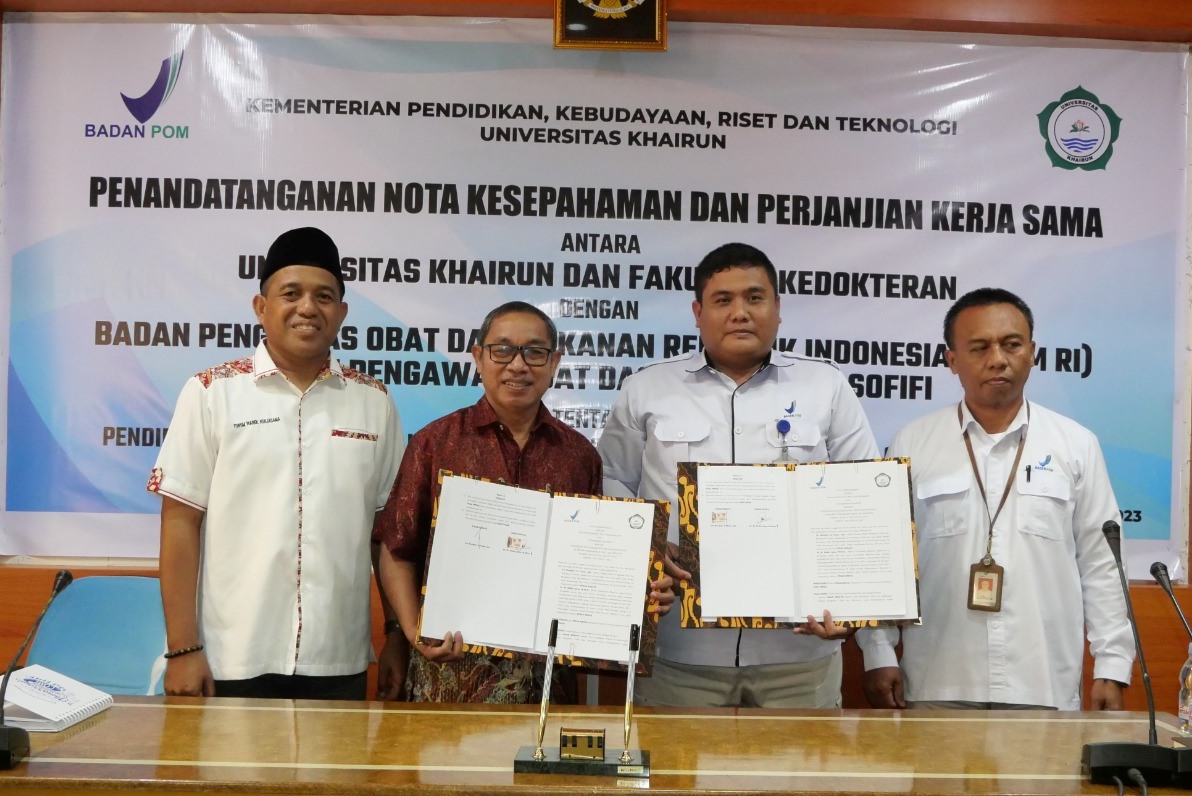 Unkhair. Universitas Khairun dan Badan Pengawasan Obat dan Makanan (BPOM) Provinsi Maluku Utara kembali melakukan penandatangan Memorandum of Understanding (MoU). Penandatangan nota kesepahaman itu berlangsung di Lantai III, ruang Senat gedung Rektorat Universitas Khairun, Rabu, 26 Juli 2023.
