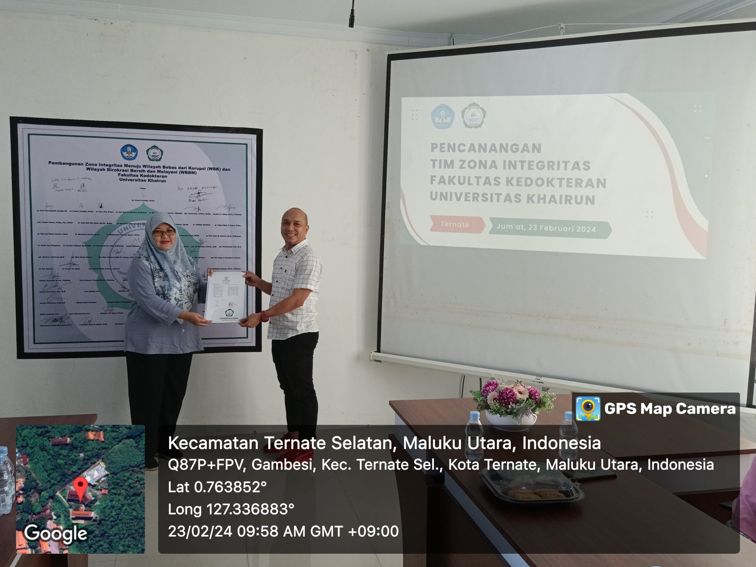 UNKHAIR-Fakultas Kedokteran (FK) Universitas Khairun (Unkhair), Ternate kembali menyelenggarakkan pencanangan pembangunan Zona Integritas (ZI) menuju Wilayah Bebas dari Korupsi (WBK), wujudkan Wilayah Birokrasi Bersih dan Melayani (WBBM), libatkan seluruh jajaran di lingkup FK.