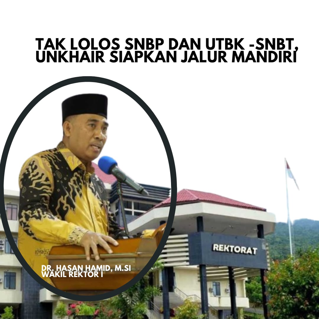Wakil Rektor I, Bidang Akademik, Dr. Hasan Hamid, M. Si, Senin, (6/5/2024), di ruang kerjanya, menjelaskan bagi calon mahasiswa yang tidak lolos di Jalur Seleksi Nasional Berdasarkan Prestasi (SNBP), maupun Ujian Tulis Berbasis Komputer Seleksi Nasional Berdasarkan Tes (UTBK-SNBT), Unkhair membuka kesempatan jalur Mandiri melalui dua gelombang.