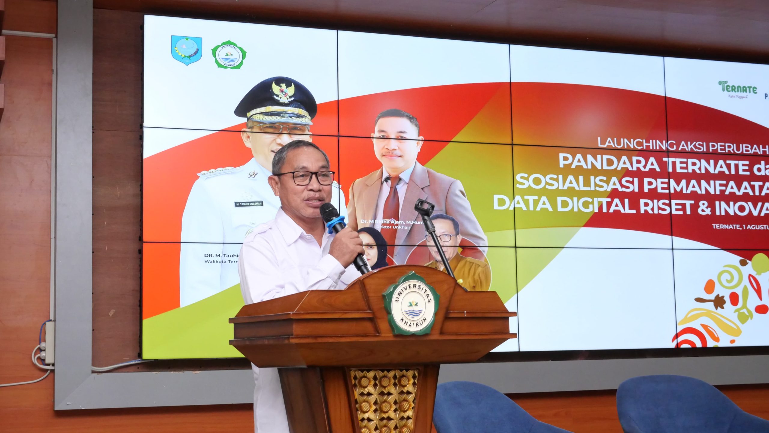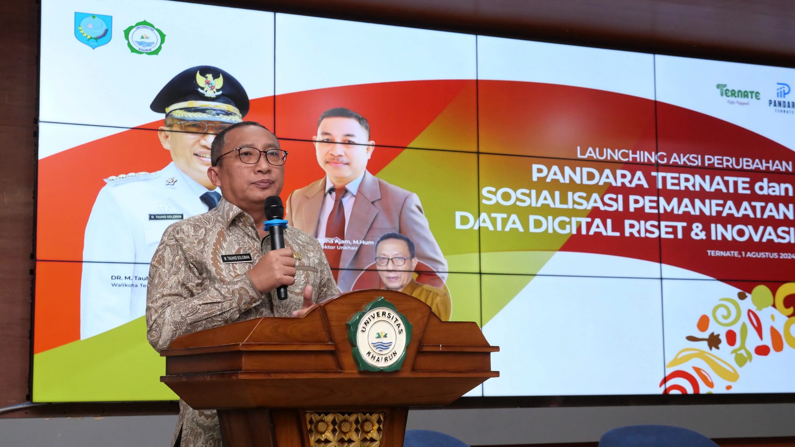 UNKHAIR–Demikian di ungkapkan Wali Kota Ternate, Dr. M Tauhid Soleman, M. Si saat menyampaikan sambutannya di acara launching implementasi aksi perubahan Pangkalan Data Digital Riset dan Inovasi (PANDARA) Ternate, Lt. 4 Aula Nuku Rektorat Kampus 2, Gambesi Kota Ternate Selatan, Kamis (1/8/2024).