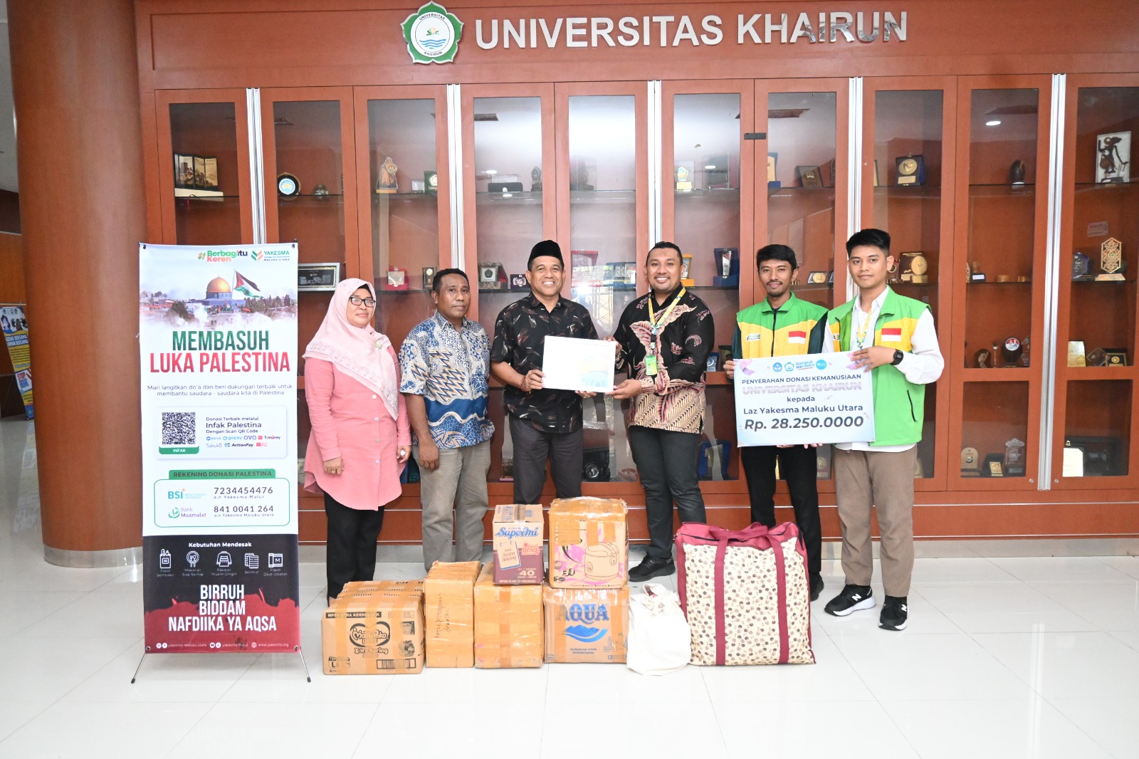 Penyerahan donasi di dampingi Kepala Biro Umum, Kepegawaian dan Keuangan (BUKK) Unkhair, M. Tahir Abdul Kadir, SH, Koordinator Bagian Umum, Dasmawati, SE, Kepala Cabang Yakesma Provinsi Maluku Utara, Abu Rahmat Ibrahim, S. TP., M. Sc.