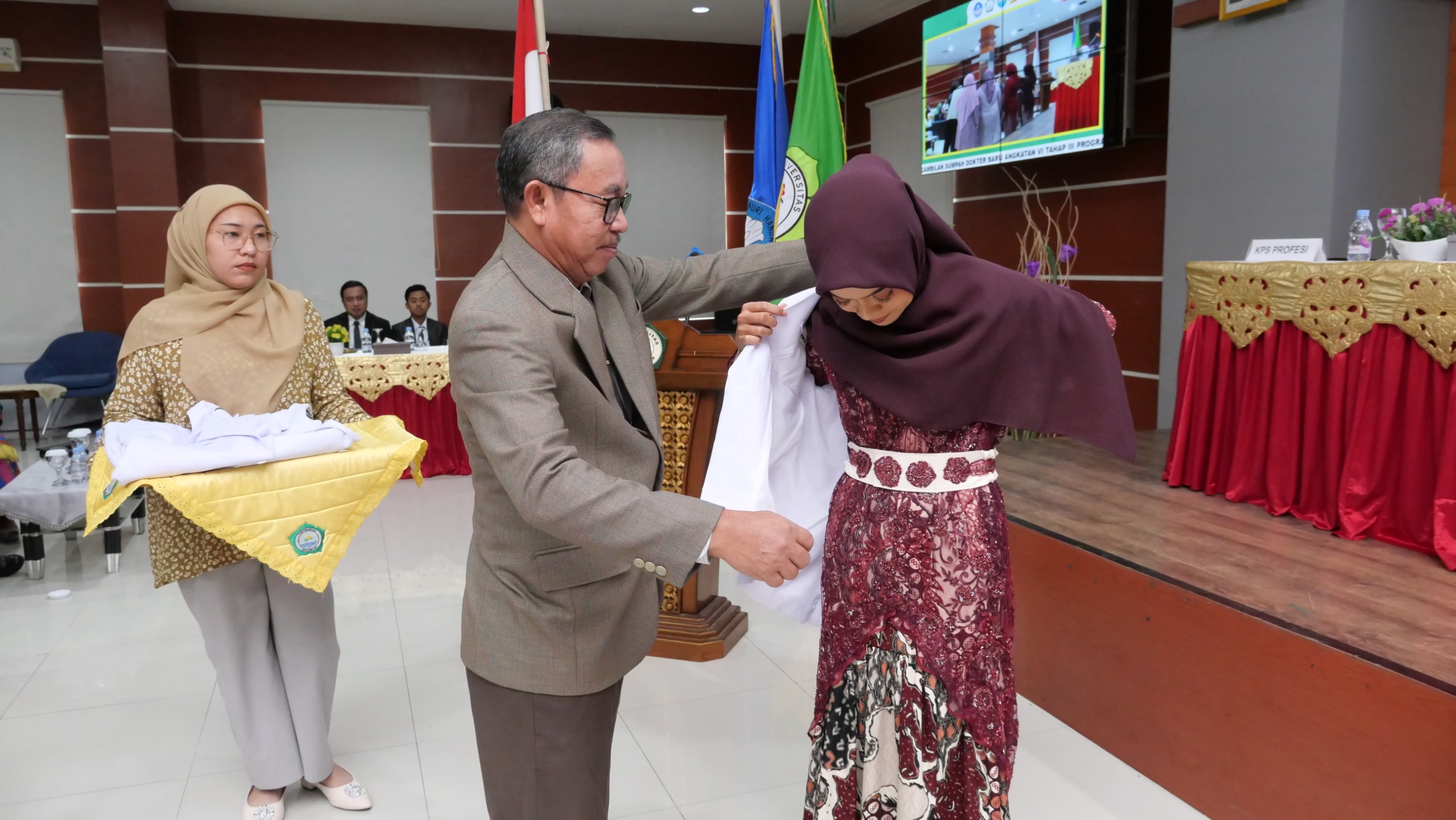 Prosesi sumpah dokter dilanjutkan dengan penyematan jas dokter oleh Rektor Unkhair, Dr. M. Ridha Ajam, M. Hum, Dekan Fakultas Kedokteran dr. Liasari Armaijn, M. Kes, dan Ketua Senat Fakultas Kedokteran, dr. Dewi Darmayanti, SP. Rad.