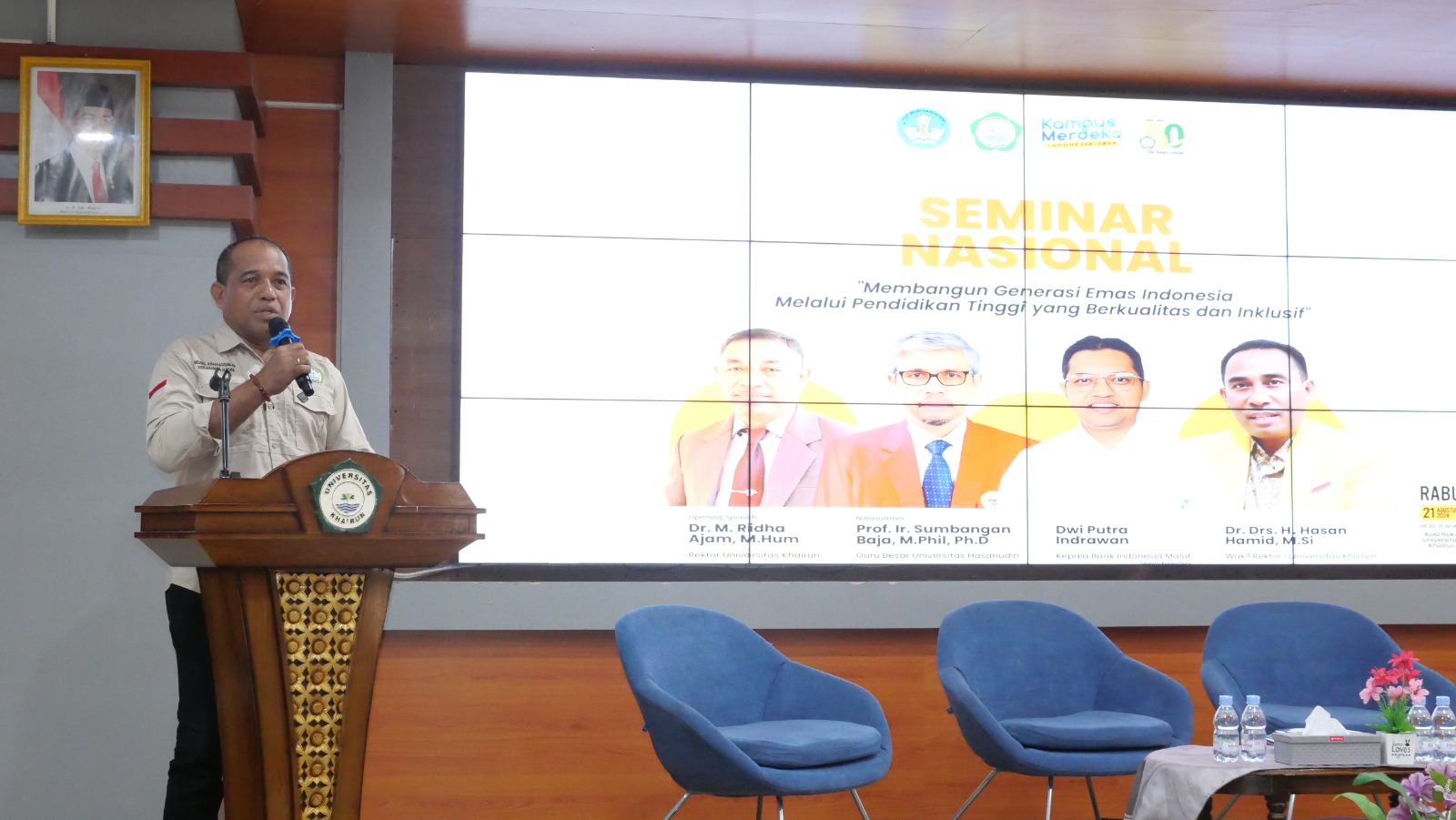 Seminar nasional menghadirkan pembicara dari akademisi dan praktisi, yakni Sekretaris Universitas Hasanuddin (Unhas) Makassar, Prof. Ir. Sumbangan Baja, M.Phil, Ph.D, Kepala Perwakilan Bank Indonesia (BI) Maluku Utara, Dwi Putra Indrawan, yang dipandu dosen Fakultas Ekonomi dan Bisnis (FEB) Unkhair, Asril Arilaha, SE., MM.