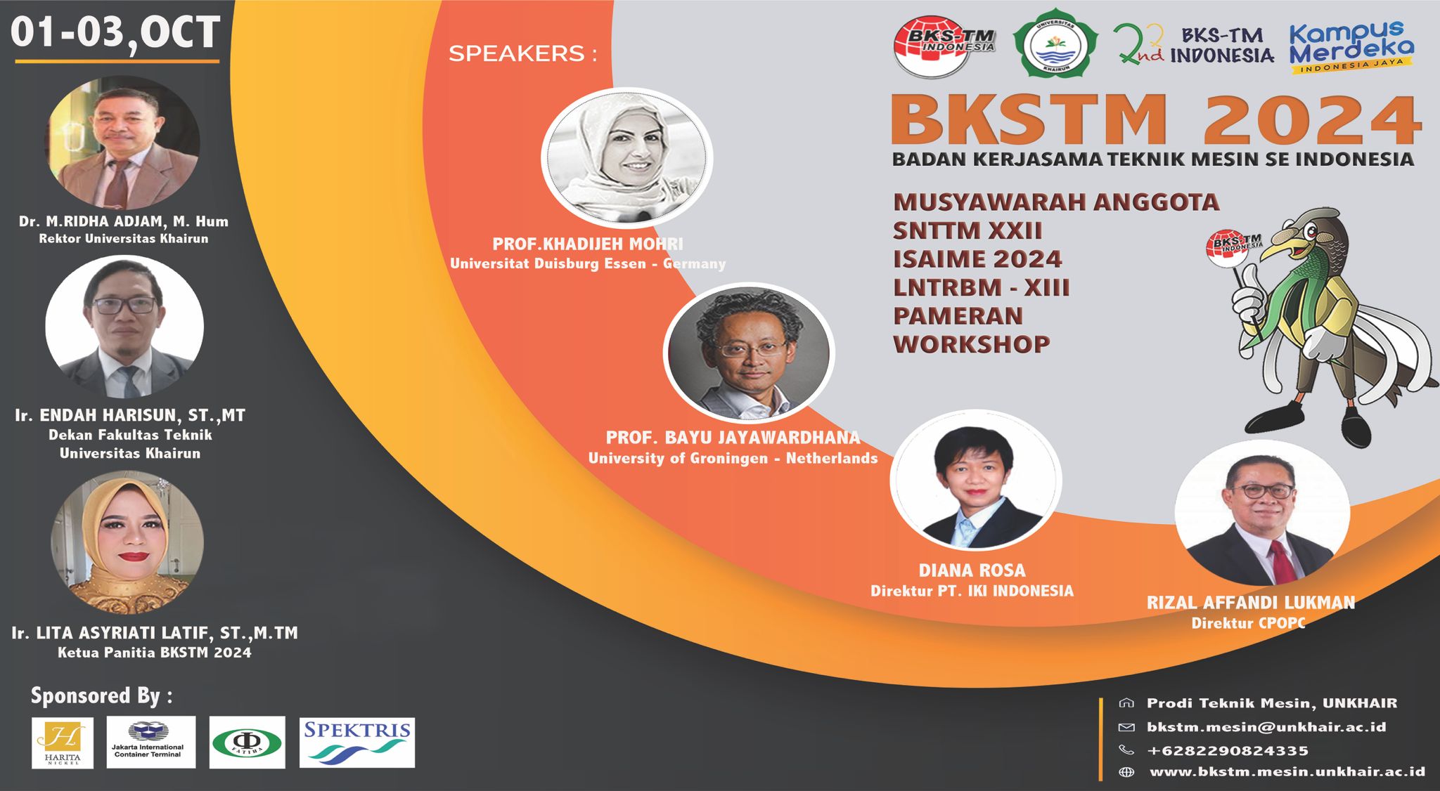 UNKHAIR–Universitas Khairun (Unkhair) Ternate melalui Program Studi Teknik Mesin Fakultas Teknik, akan menjadi tuan rumah perhelatan besar Badan Kerja Sama Teknik Mesin (BKSTM) Se-Indonesia pada tahun 2024. Acara ini akan berlangsung pada 1-3 Oktober 2024 di Hotel Bela Ternate dan dihadiri oleh lebih dari 400 perwakilan dari berbagai perguruan tinggi di seluruh Indonesia.