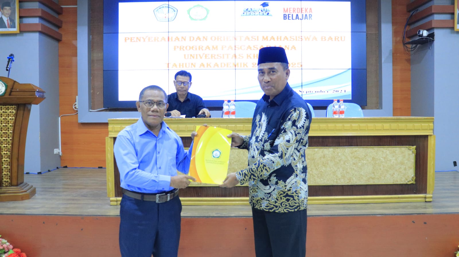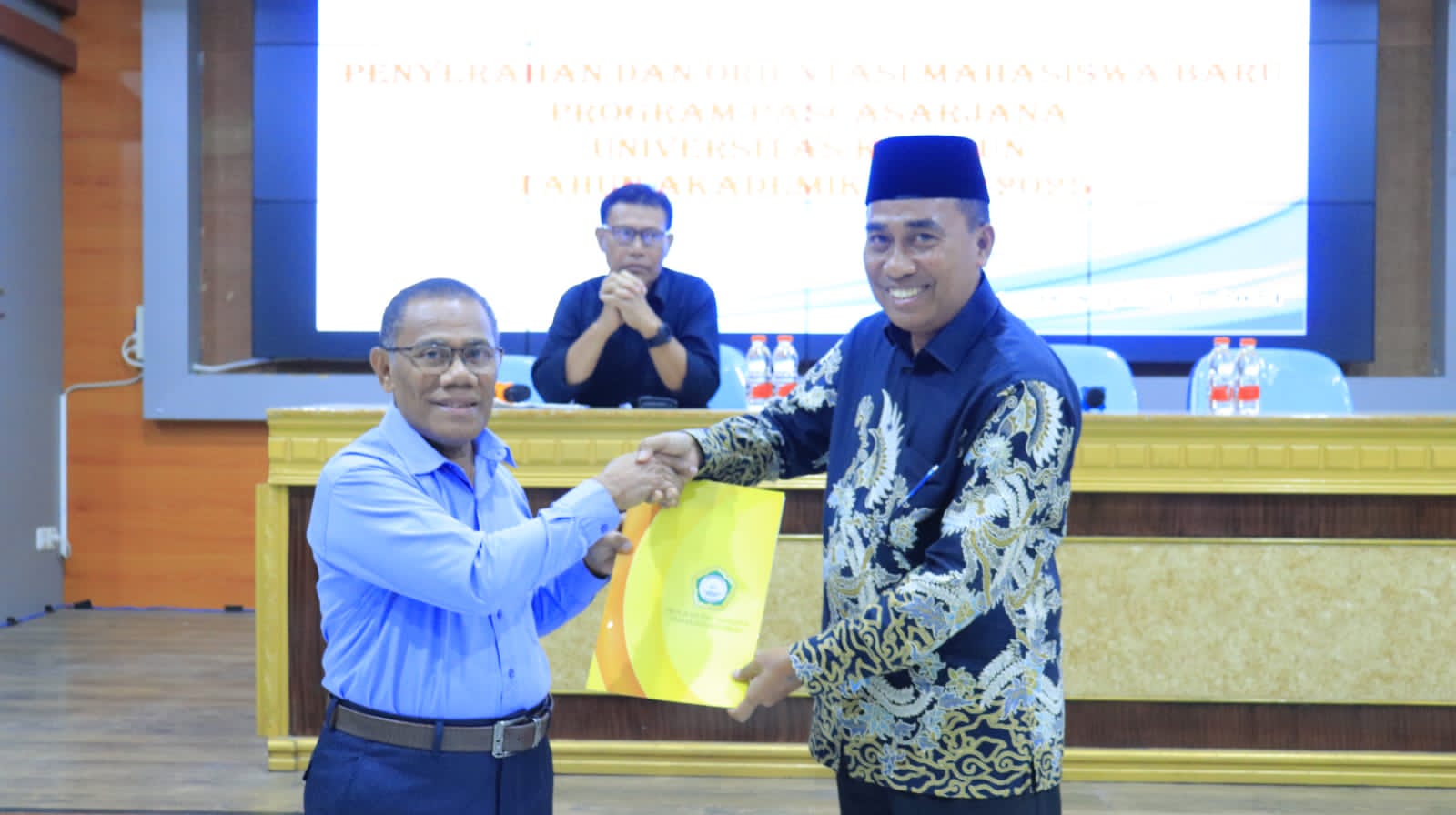 Direktur Pascasarjana Prof. Dr. Wahab Hasym, M.Si Menyerahkan Mahasiswa Baru ke Warek Dr. Hasan Hamid, M.Si (Dok. Humas).
