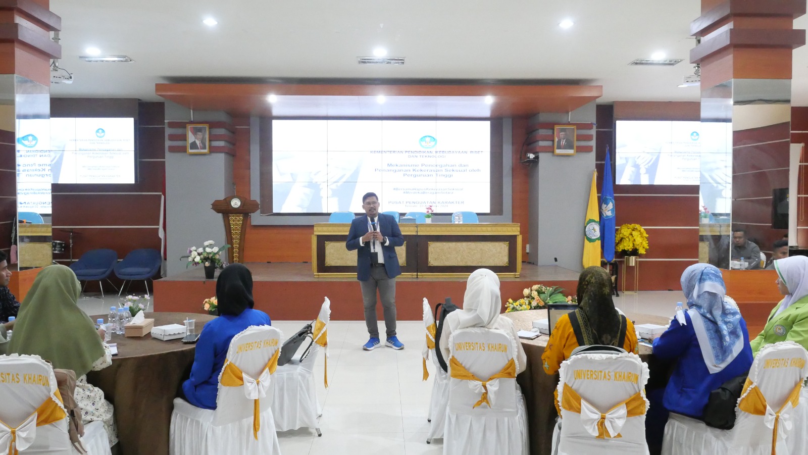 Menghadirkan pembicara, terdiri dari Ketua Tim Akademik dan Kemahasiswaan LLDIKTI Wilayah XII, Tahir Wasahua, Tim Pencegahan Kekerasan Seksual Pusat Penguatan Karakter Kemendikbudristek, Pebi Sukamdani, S. Sos, Kasubdit PPKS Universitas Negeri Surabaya, Iman Pasu Purba, SH., MH, serta Dr. Yumima Sinyo, M. Si, Ketua Satgas PPKS dar Unkhair.