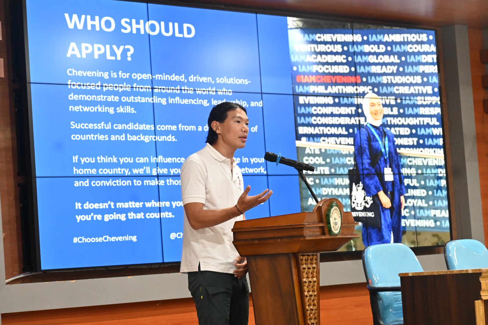 Alex Lau dari Kedutaan Inggris kemudian memberikan sosialisasi terkait beasiswa Chevening, sebuah program beasiswa penuh untuk studi S2 di Inggris.
