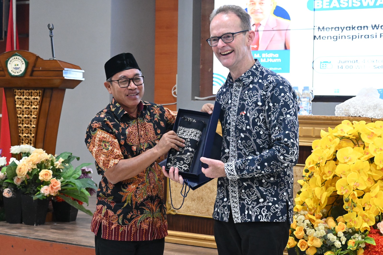Rektor Unkhair, Dr. M. Ridha Ajam, M.Hum, dalam sambutannya, mengucapkan terima kasih kepada Duta Besar Inggris atas penyelenggaraan kuliah umum ini.