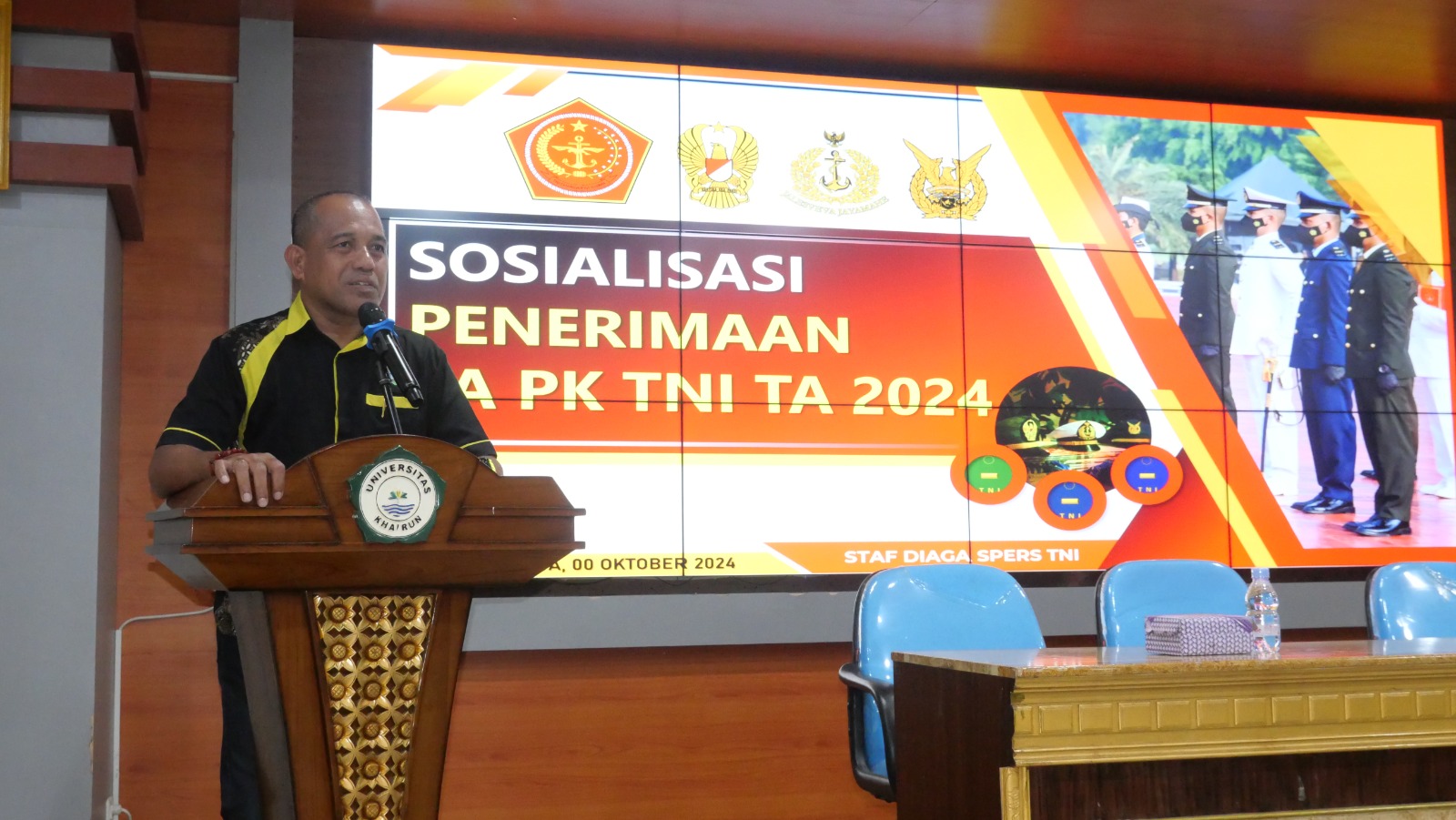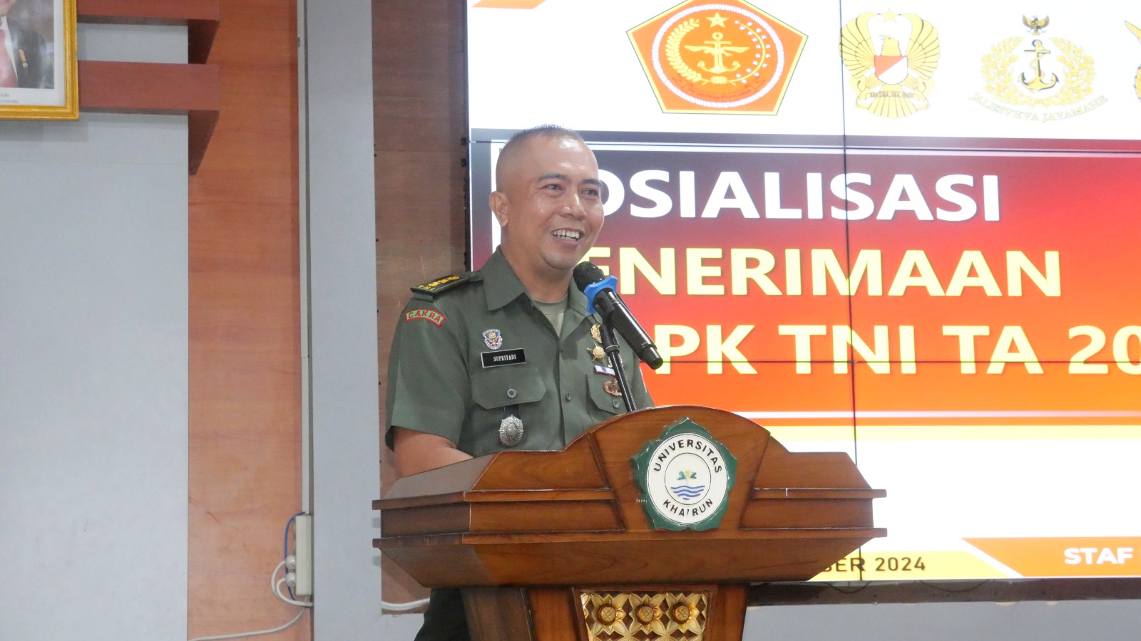 UNKHAIR–Kepala Ajudan Jenderal Korem (Ajenrem) 152/ Babullah Letkol Caj Supriyadi Satria Mustika, S.E, menggelar sosialisasi penerimaan Perwira Prajurit Karier Tentara Nasional Indonesia (PA-PK TNI) Tahun 2024 di Universitas Khairun (Unkhair), bertempat di Aula Nuku Gedung Rektorat Kampus II, Gambesi Kota Ternate, Rabu (16/10/2024).