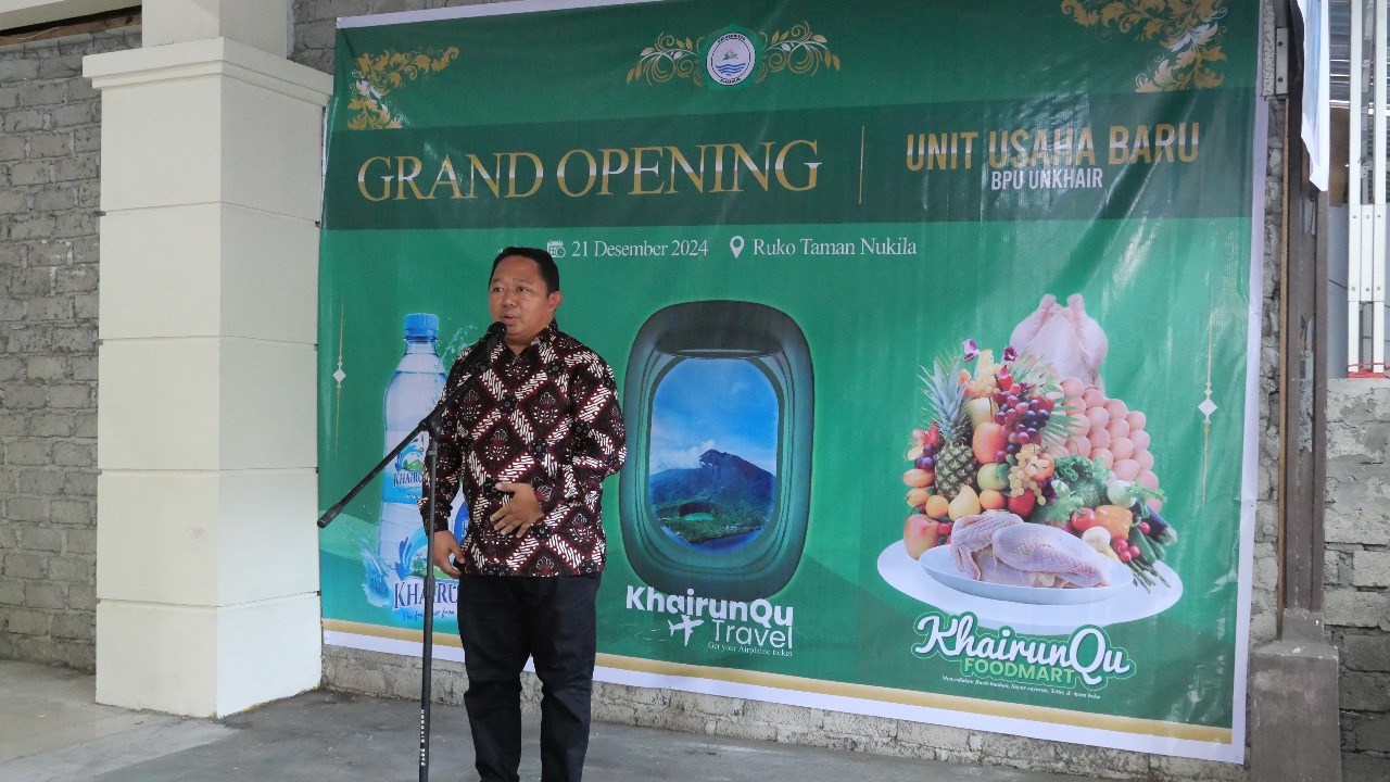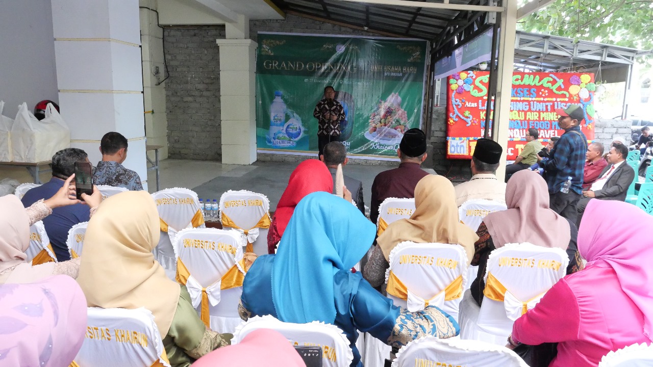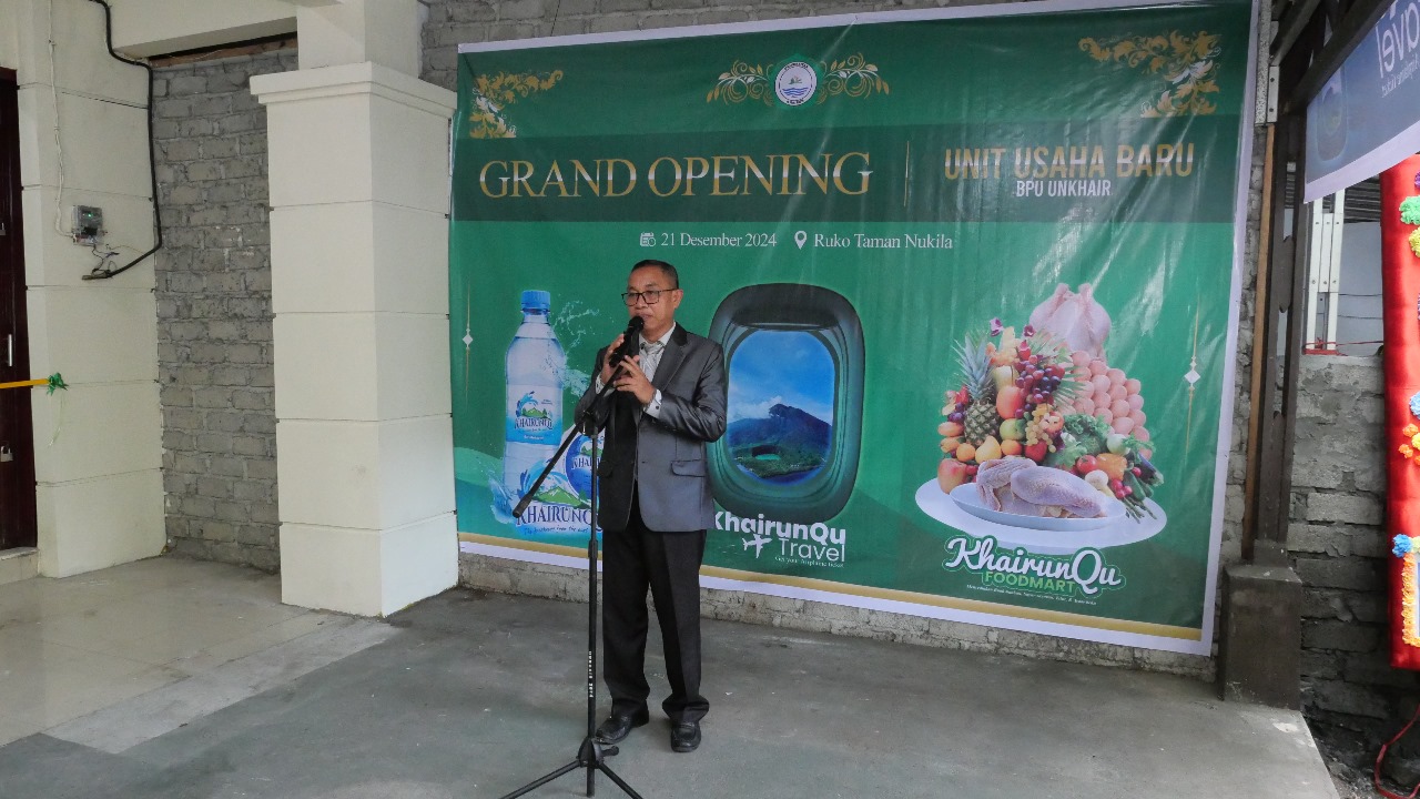 Acara grand opening tersebut, Rektor Unkhair Dr. M. Ridha Ajam, M. Hum, secara simbolis menggunting pita dan meresmikan Air Mineral Khairunqu, Travel Khairunqu, dan Food Mart Khairunqu.