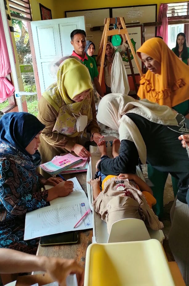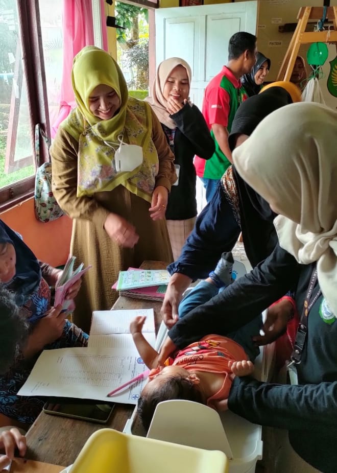 Setelah penyuluhan, tim melanjutkan dengan kegiatan skrining stunting yang melibatkan pengukuran tinggi badan, berat badan, lingkar kepala, dan lingkar lengan atas anak-anak yang hadir.