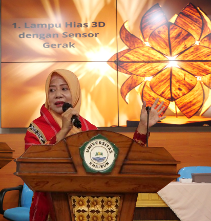 Ketua I DWP Unkhair Bidang Pendidikan, Hj. Iriany Hasan, S.Pd., M.Pd, memperkenalkan karya seni 3G/triji berbahan dasar daun pisang kering yang diolah menjadi lampu hias unik.