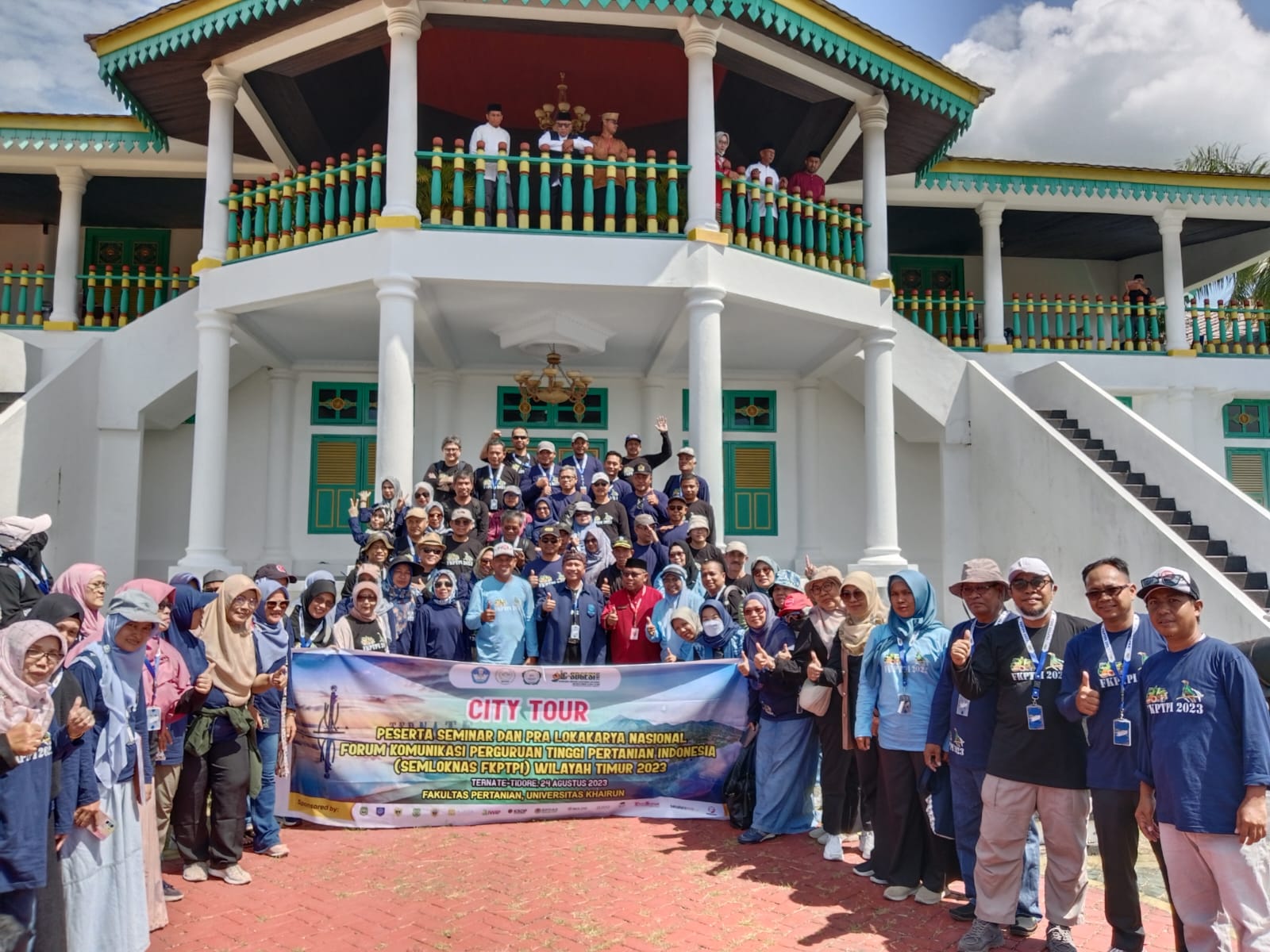 Unkhair. Sebanyak 150 peserta Seminar dan Pra Lokakarya Nasional Forum Komunikasi Perguruan Tinggi Pertanian Indonesia (SEMILOKNAS-FKPTPI) Se-Indonesia city tour (tur kota) ke Kota Tidore Kepulauan (Tikep), Kamis 24/08/2023. Lokawisata itu, diinisiasi tuan rumah Fakultas Pertanian, Universitas Khairun (Unkhair).