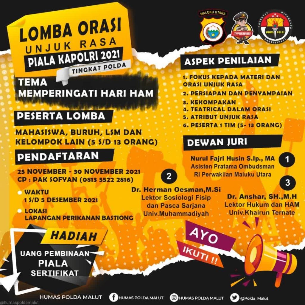 Untuk diketahui Kepolisian Daerah Maluku Utara, melalui Bidang Humas menggelar lomba Orasi dan Unjuk Rasa ini mengusung tema “ Memperingati Hari Hak Asasi Manuasia (HAM)”. Lomba orasi yang diselengrakan Bidang Humas merupakan program Mabes POLRI yang digelar ditingkat MAPOLDA di seluruh Indonesia.