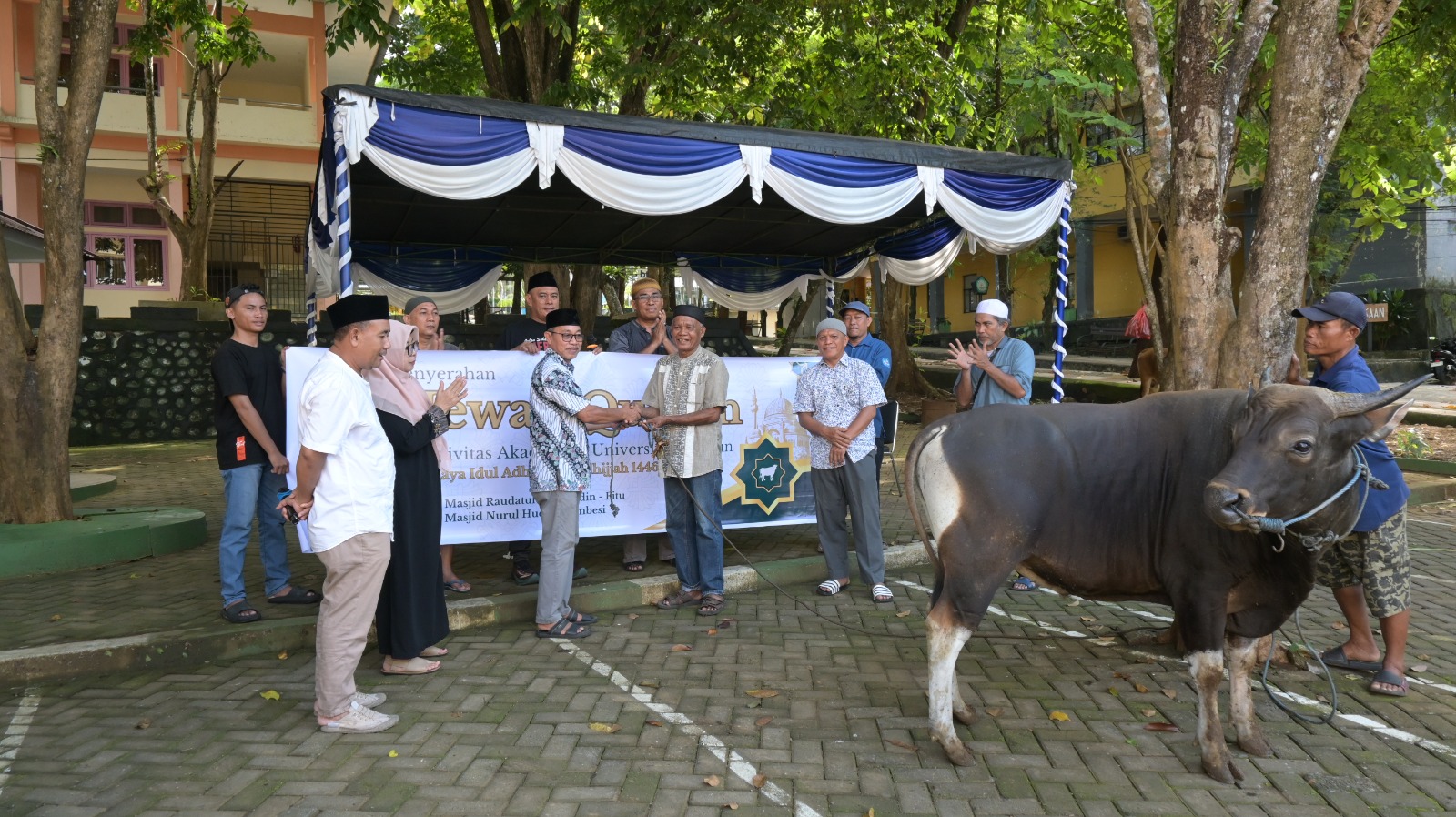 Penyerahan secara simbolis hewan kurban berupa dua ekor sapi dilaksanakan langsung Rektor Unkhair Dr. M Ridha Ajam, M.Hum, kepada Imam Masjid Nurul Huda Kelurahan Gambesi, Said Hi. Talib serta Imam Masjid Raudatul Murtasyidin Kelurahan Fitu Mudin M. Bakar.